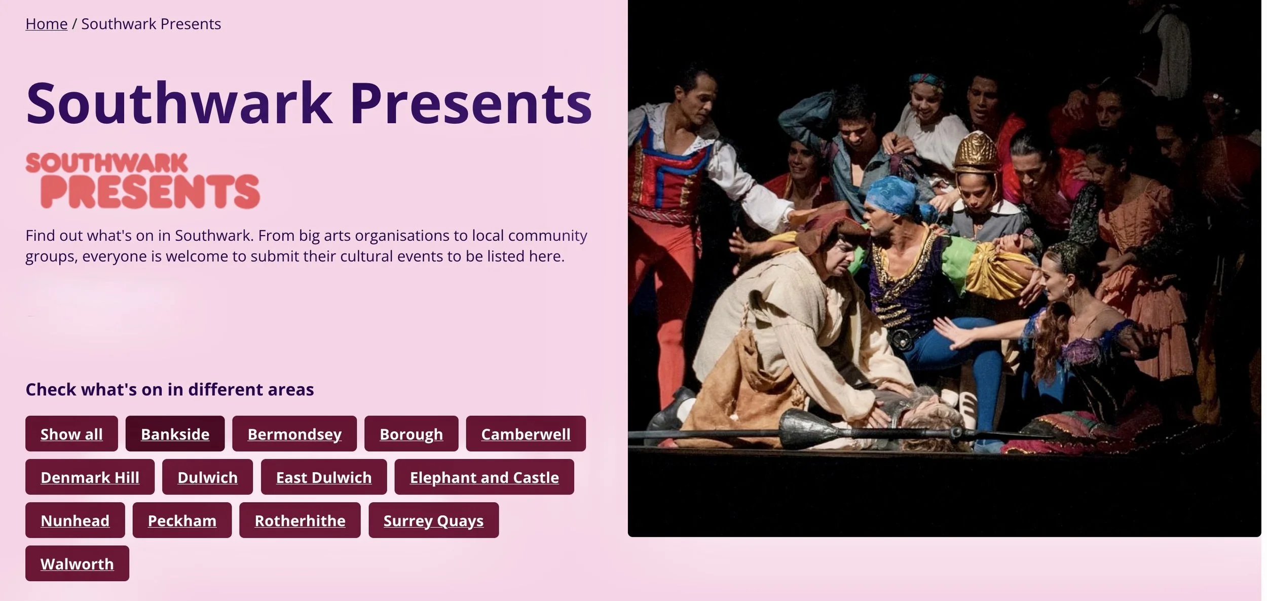 Southwark Presents is another area on Southwark Council’s website where you can find out about lots of things going on in the area.